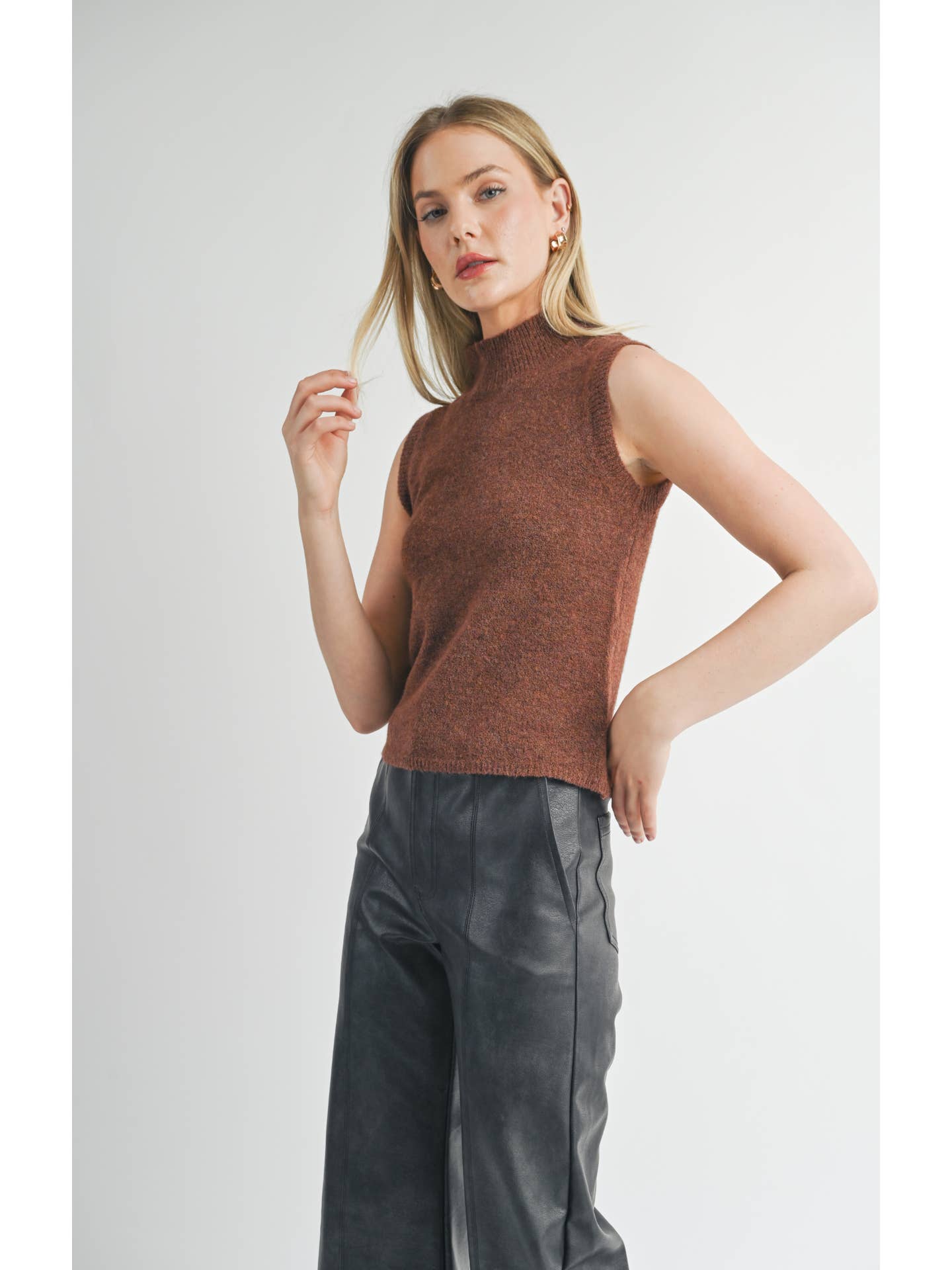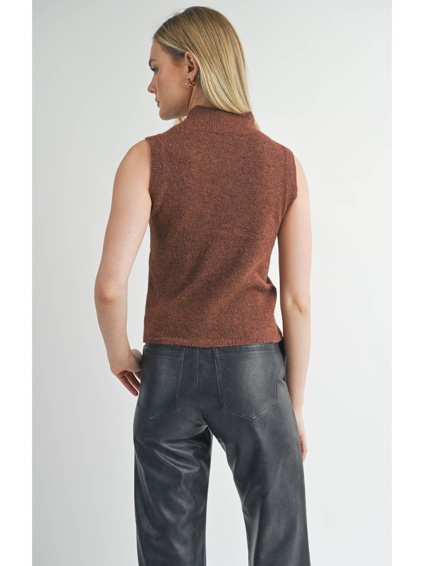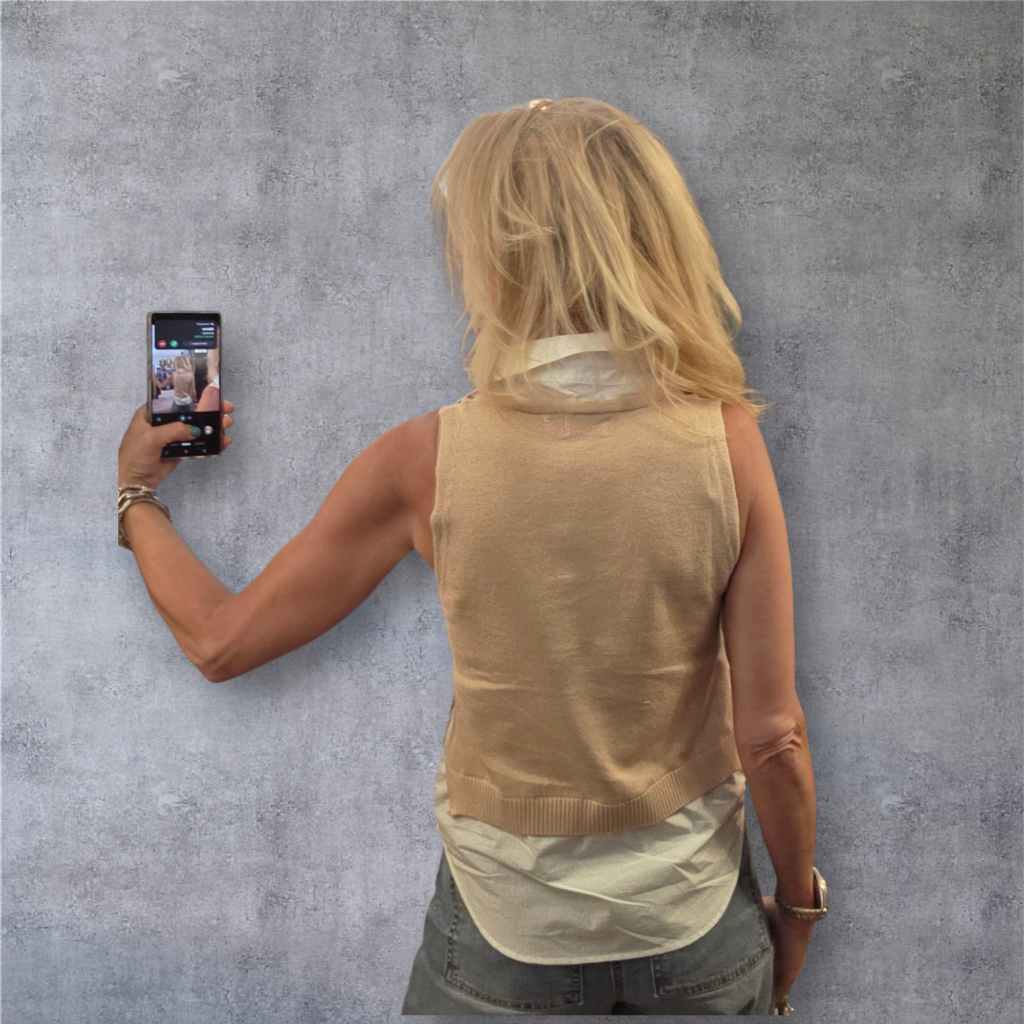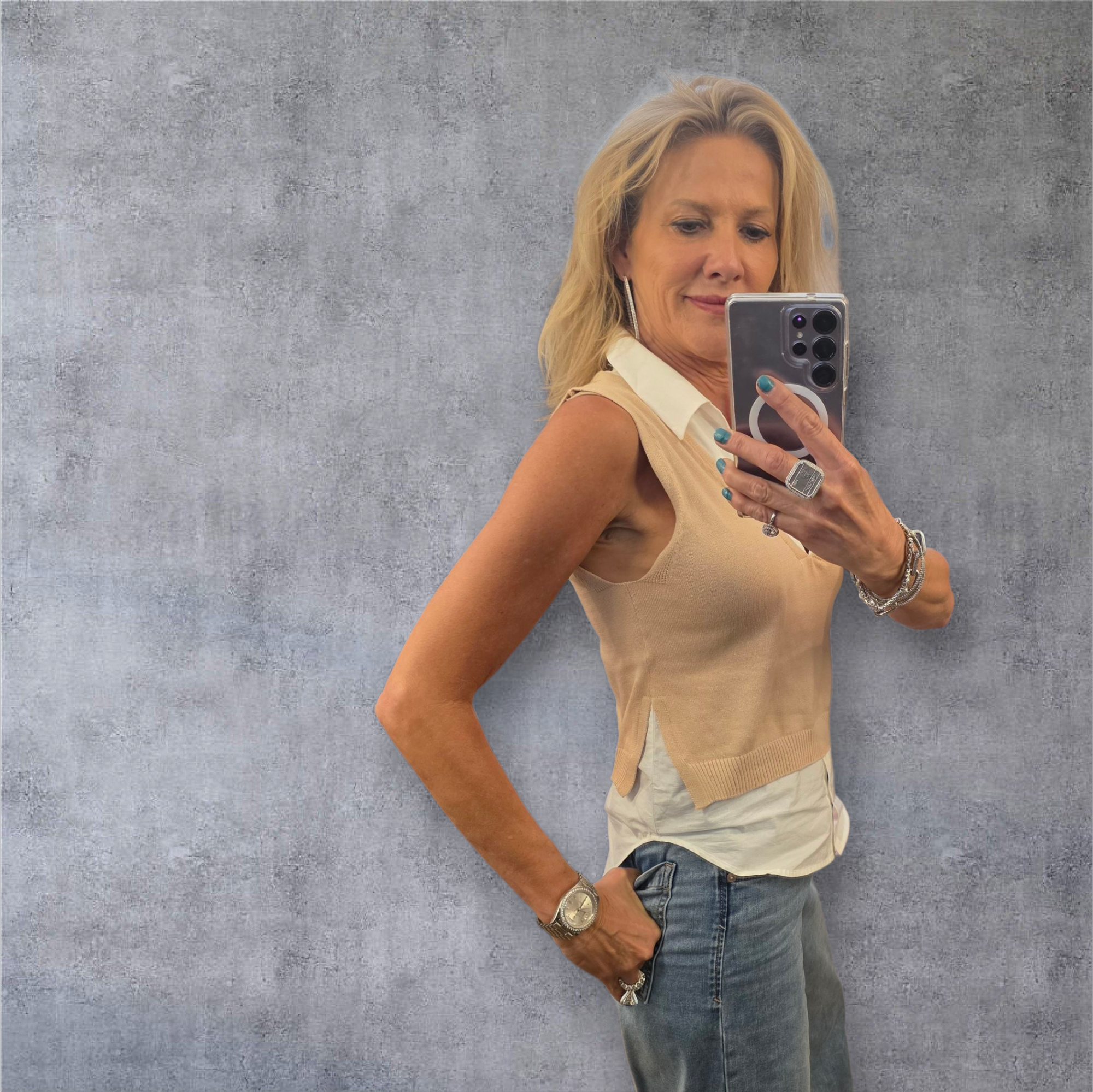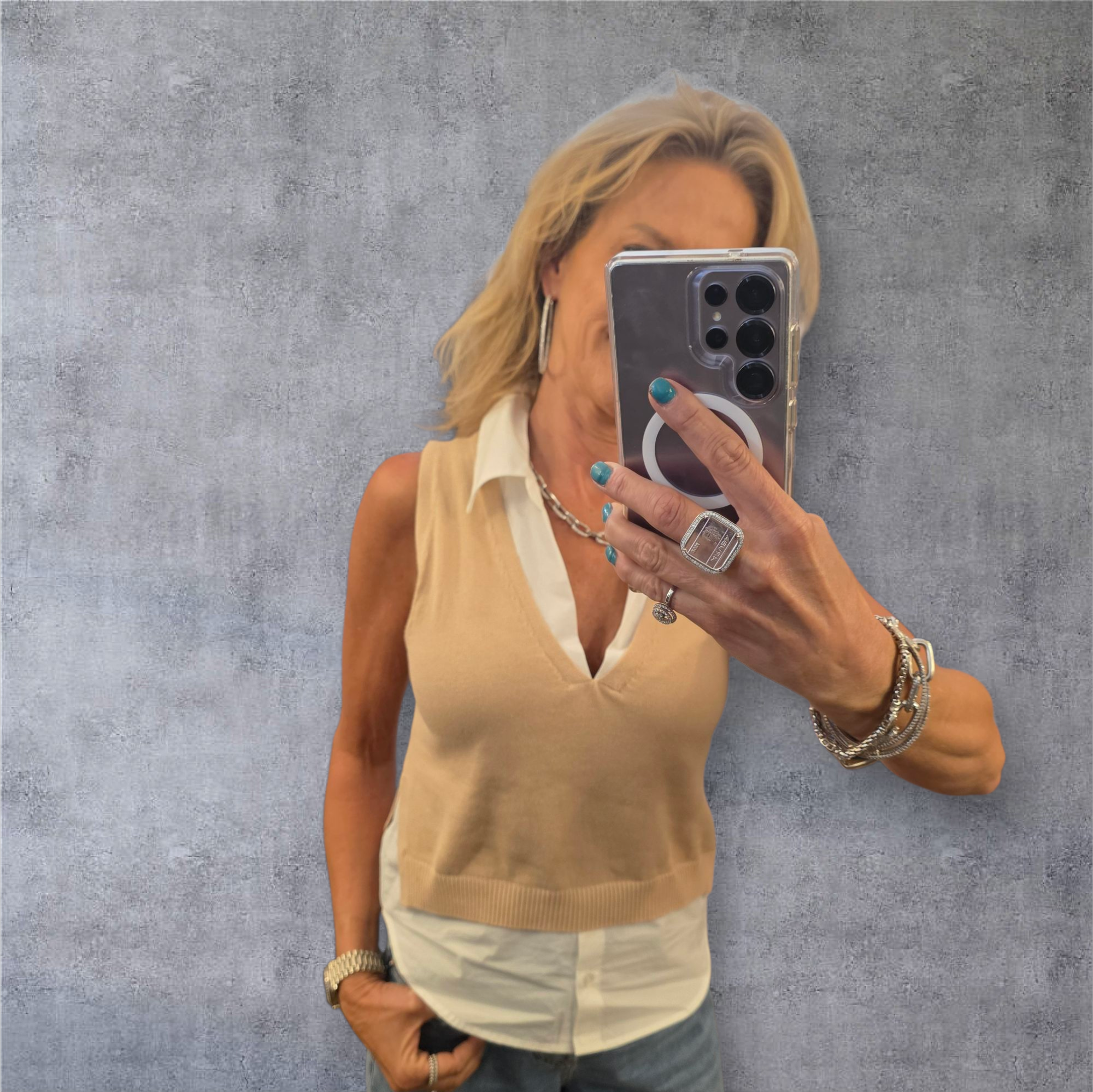 TAN/WHITE V-NECK SLVLESS SWEATER