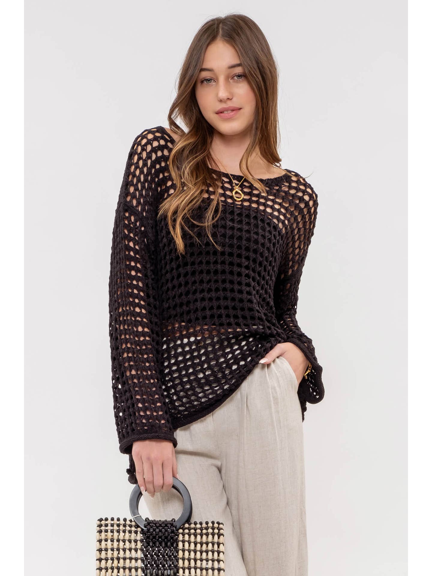 BLACK SCOOP NECK OPEN KNIT SWEATER