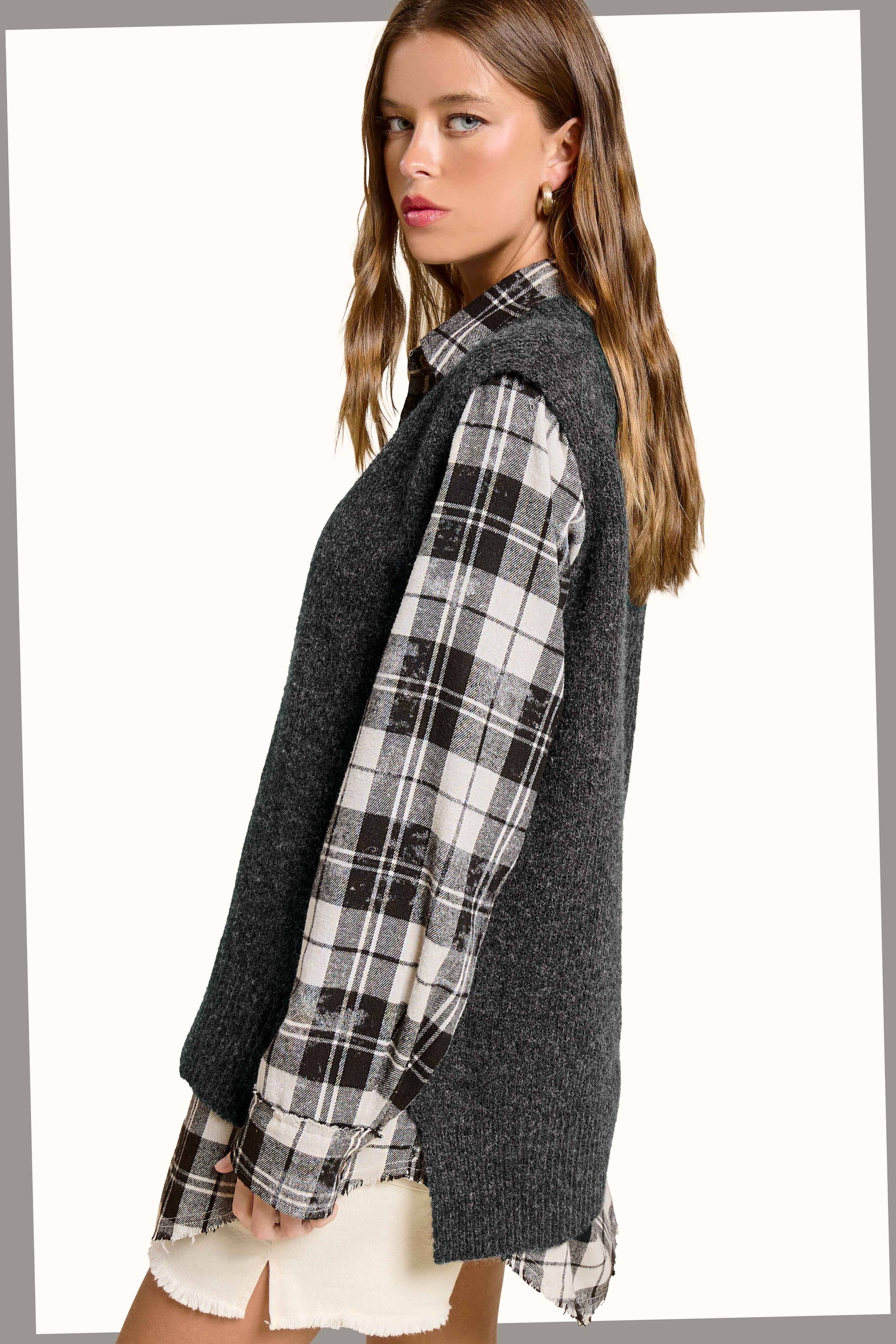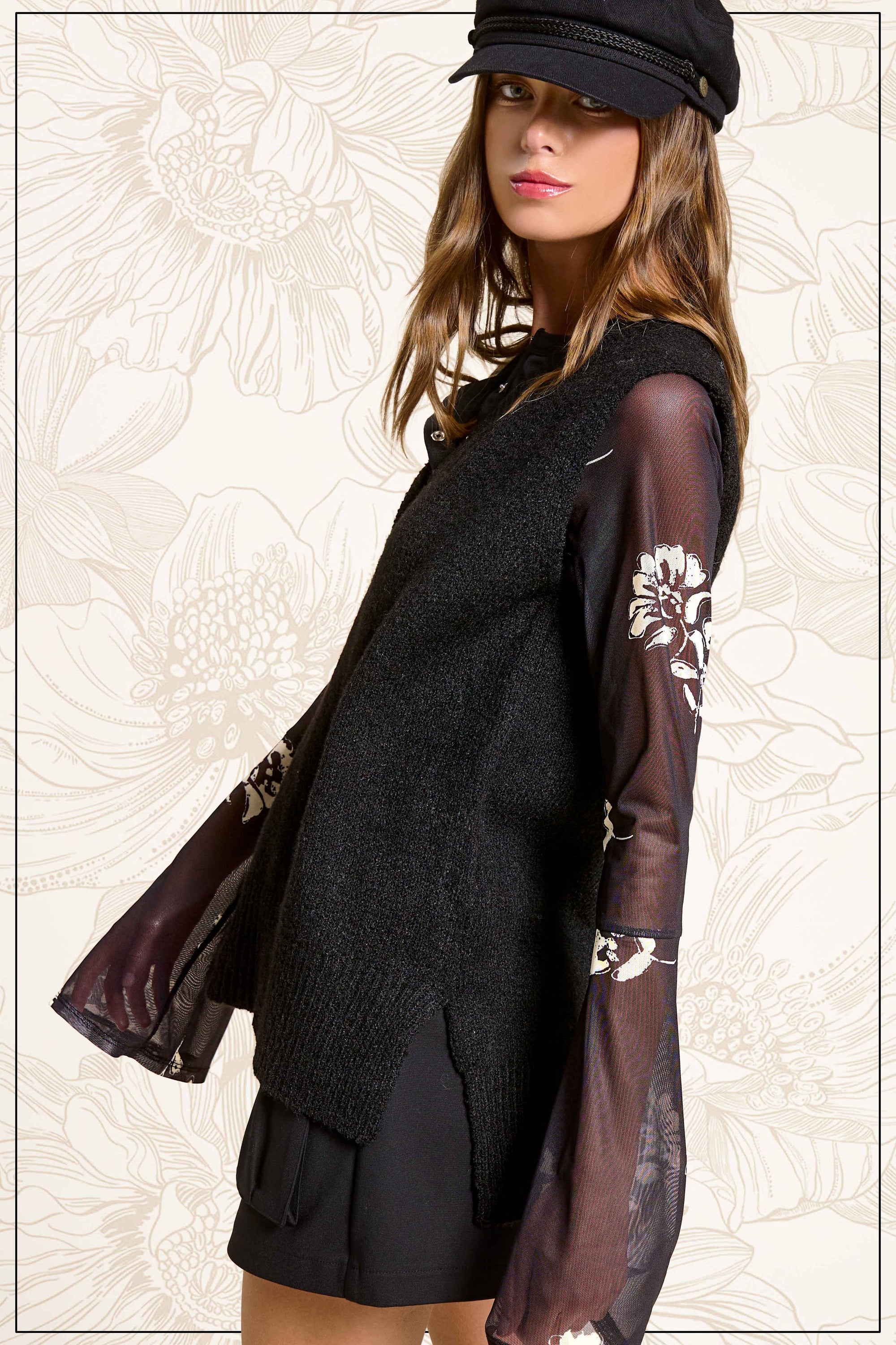 MCS3589-Oversized Soft Knit Sweater Vest with Side Slit: Black Sesame