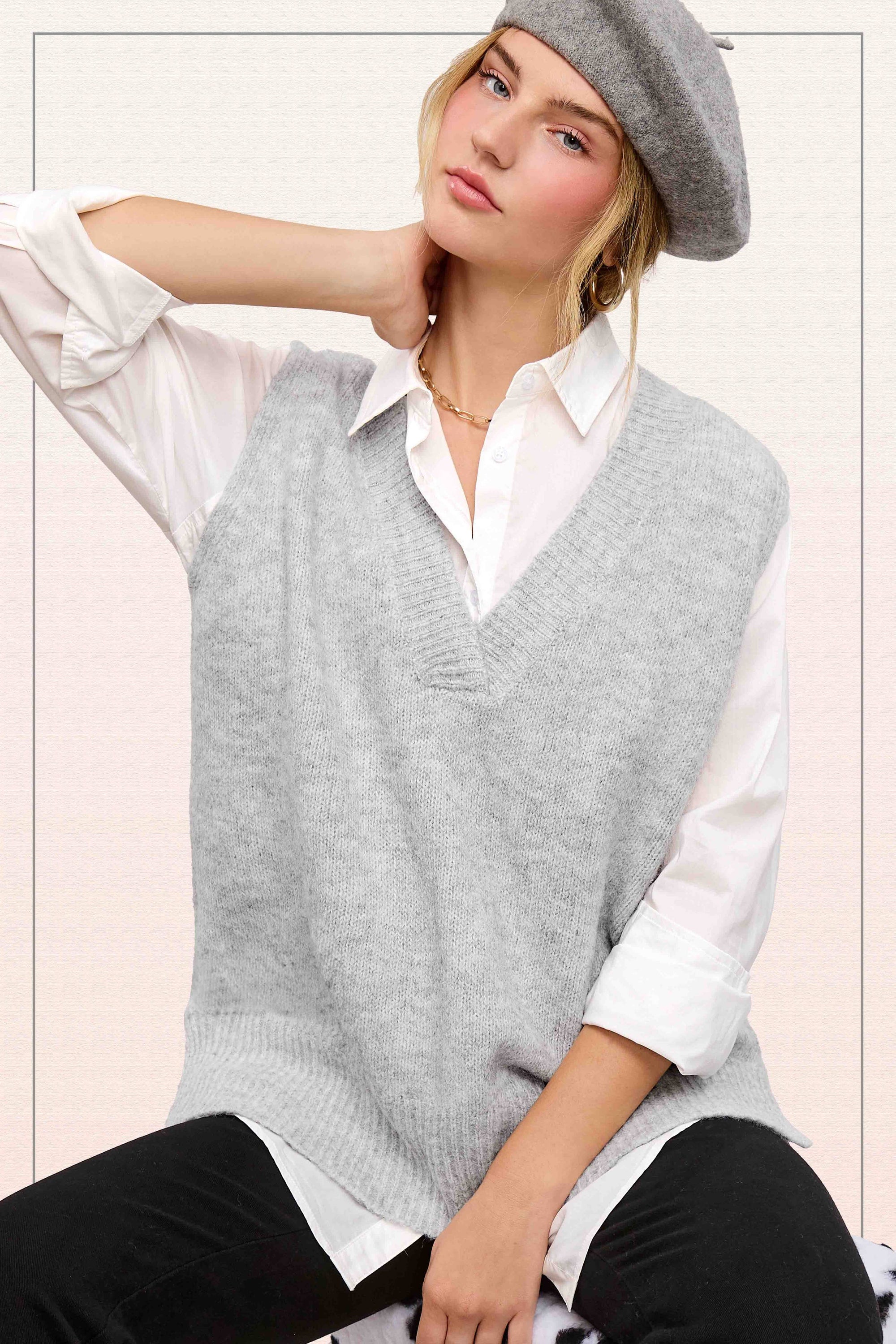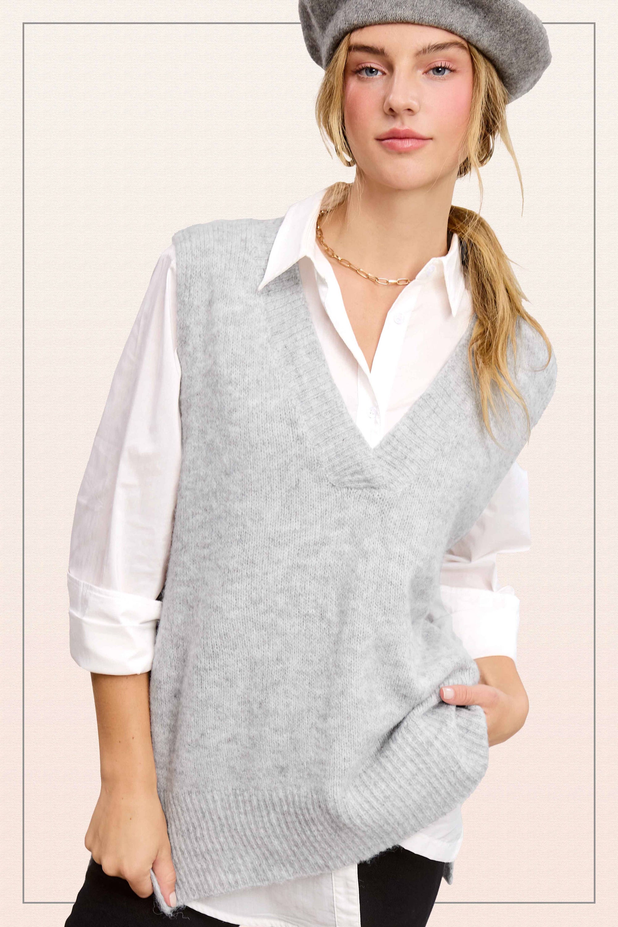 MCS3589-Oversized Soft Knit Sweater Vest with Side Slit: H.Grey