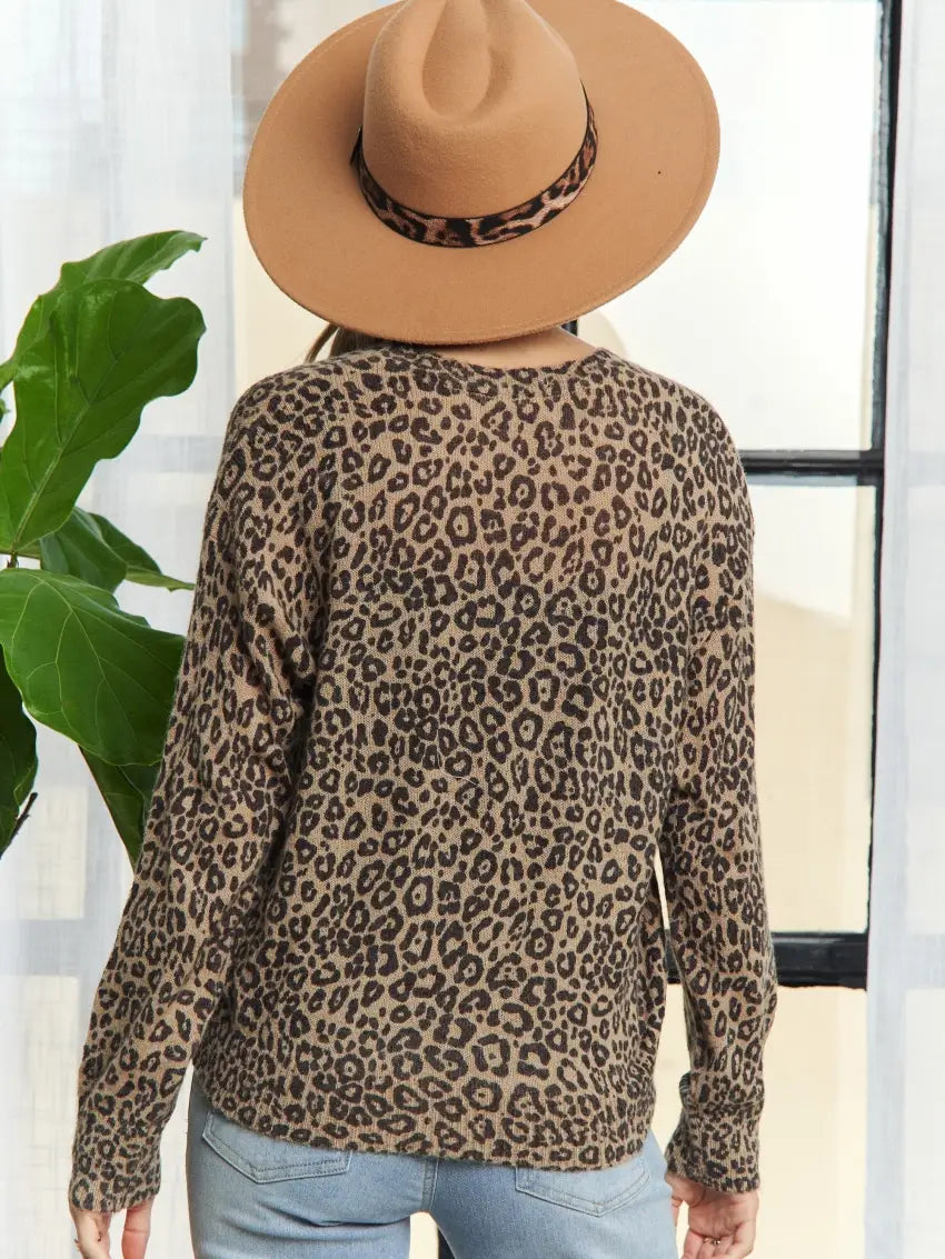 LEOPARD PRINT LONG SLEEVED CREW NECK TOP: BROWN